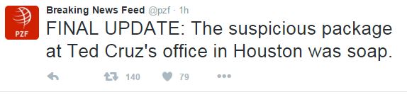 Ο 45χρονος γερουσιαστής του Τέξας παρέλαβε δέμα, το οποίο θεωρήθηκε ύποπτο. Σχεδόν άμεσα κινητοποιήθηκαν οι Αρχές. Κατέφθασαν στα γραφεία του Κρουζ στο Χιούστον και μετά από ενδελεχή έρευνα διαπιστώθηκε πως δεν πρέπει ουδείς να ανησυχεί.