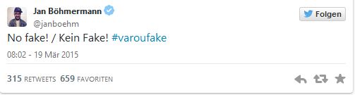 Στη συνέχεια μάλιστα, ο παρουσιαστής της σατιρικής εκπομπής Γιαν Μπέμερμαν, tweetαρε στον προσωπικό του λογαριασμό τις λέξεις «No fake!» προκαλώντας σύγχυση στους χρήστες σχετικά με το τι τελικά συμβαίνει στην πραγματικότητα με τη χειρονομία του Βαρουφάκη.