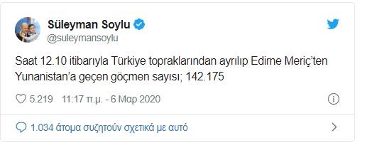 Τον “χαβά” της η Τουρκία καθώς επιμένουν κυβερνητικοί αξιωματούχοι της να παρουσιάζουν “φουσκωμένο” τον αριθμό μεταναστών και προσφύγων που έχουν μετακινηθεί προς τον Έβρο. Ο Τούρκος υπουργός Εσωτερικών, Σουλεϊμάν Σοϊλού σε ανάρτησή του στο Twitter αναφέρει χαρακτηριστικά ότι “μέχρι σήμερα, στις 12.10 το πρωί (ώρα Τουρκίας) έχουν φύγει από τα εδάφη της Τουρκίας και την Ανδριανούπολη κι έχουν μετακινηθεί προς τον Έβρο, στην Ελλάδα, 142.175 πρόσφυγες”.