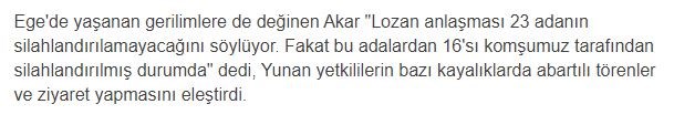 Συγκεκριμένα μιλώντας για την κατάσταση στο Αιγαίο και τεταμένο κλίμα που επικρατεί ανάμεσα στην Τουρκία και την Ελλάδα, ο κ. Ακάρ επισήμανε: «Σύμφωνα με τη Λωζάννη, 23 νησιά στο Αιγαίο δεν πρέπει να είναι στρατιωτικοποιημένα, όμως 16 απ’ αυτά έχουν όπλα και στρατό από πλευράς των γειτόνων μας».