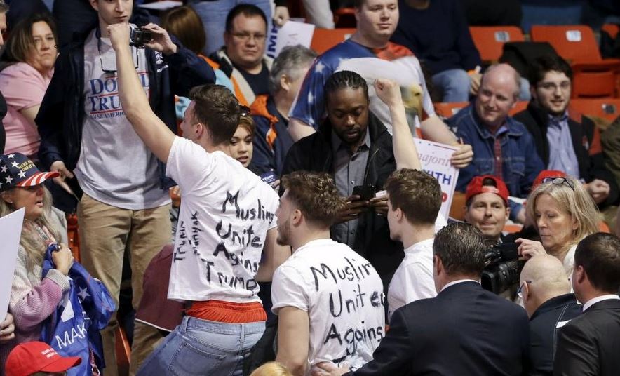 Έτσι η εκδήλωση δεν ξεκίνησε ποτέ. Ανακοινώθηκε η αναβολή της επ’ αόριστον με υποστηρικτές του, βέβαια, να φωνάζουν ρυθμικά: «Θέλουμε τον Τραμπ, θέλουμε τον Τραμπ» παίζοντας ταυτόχρονα μπουνιές με ακτιβιστές και διαδηλωτές κατά της υποψηφιότητας του Αμερικανού δισεκατομμυριούχου.