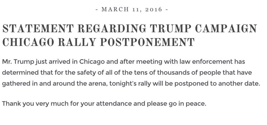 Ο υποψήφιος για το χρίσμα των Ρεπουμπλικάνων στις προεδρικές εκλογές των ΗΠΑ τον προσεχή Νοέμβριο ήταν προγραμματισμένο να μιλήσει στο Σικάγο. Ωστόσο, κάτι τέτοιο δεν έγινε και αυτό γιατί υπήρχαν ενδείξεις πως εντός του Πανεπιστήμιο του Ιλινόις, όπου θα γινόταν η εκδήλωση, υπήρχαν διαδηλωτές κατά του εκκεντρικού Αμερικανού δισεκατομμυριούχου. Άλλωστε, πριν την έναρξη της ομιλίας υπήρξαν συγκρούσεις και εντός του χώρου ανάμεσα σε αστυνομικούς και διαδηλωτές, αλλά και υποστηρικές του Τραμπ.