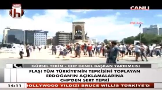 Σε πεδίο μάχης έχει μετατραπεί η πλατεία Ταξίμ της Κωνσταντινούπολης. Οι διαδηλωτές βρίσκονται στην πλατεία κρατώντας σημαίες της Τουρκίας και συνεχίζουν τις διαμαρτυρίες τους για τα έργα ανάπλασης που σχεδιάζει η κυβέρνηση Ερντογάν, ενώ είναι ισχυρή η παρουσία της Αστυνομίας.