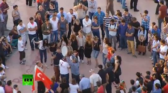 Στην πλατεία Ταξίμ το έχουν ρίξει στον…χορό. Μια ομάδα διαδηλωτών με νταούλια παίζουν μουσική και χορεύουν…
