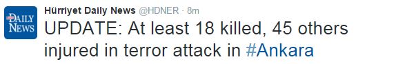 Ανεβαίνει ο αριθμός των θυμάτων από την έκρηξη στο κέντρο της Άγκυρας όπως μεταδίδουν τα διεθνή μέσα. Σύμφωνα με τη “Hurriyet Daily News” τουλάχιστον 18 άτομα έχασαν τη ζωή τους ενώ 45 τραυματίστηκαν.