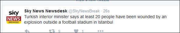 Σύμφωνα με το Sky News ο υπουργός Εσωτερικών της Τουρκίας δήλωσε ότι τουλάχιστον 20 άτομα έχουν τραυματιστεί μετά την έκρηξη που σημειώθηκε κοντά στο γήπεδο της Μπεσίκτας.