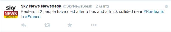 42 είναι οι νεκροί, σύμφωνα με τις πρώτες πληροφορίες του Skynews, μετά από σύγκρουση φορτηγού με λεωφορείο κοντά στην πόλη Μπορντό της Γαλλίας.