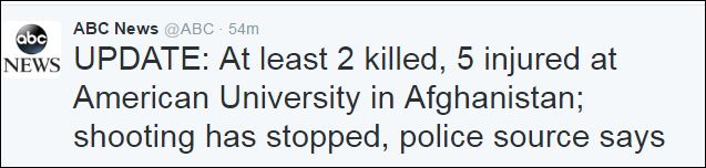 Υπενθυμίζεται ότι σύμφωνα με τον αξιωματούχο του αφγανικού υπουργείου Εσωτερικών, μια έκρηξη έπληξε το Αμερικανικό Πανεπιστήμιο και οι δράστες εισέβαλαν στο κτίριο.