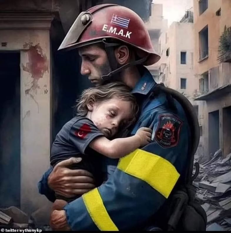 Μεταξύ των φωτογραφιών που χρησιμοποιούν οι απατεώνες, σύμφωνα με την Daily Mail, είναι και αυτή που δημιούργησε ο υποστράτηγος εν αποστρατεία, του Πυροσβεστικού Σώματος, Παναγιώτης Κοτρίδης, και δείχνει έναν άνδρα της ΕΜΑΚ να κρατά στην αγκαλιά του ένα παιδάκι από την Τουρκία. Ο κ. Κοτρίδης είχε διευκρινίσει ότι έφτιαξε την εικόνα προκειμένου να τιμήσει τους συναδέλφους του που έδωσαν μάχη για να σώσουν τους εγκλωβισμένους στα συντρίμμια κτιρίων που κατέρρευσαν, στην Τουρκία.