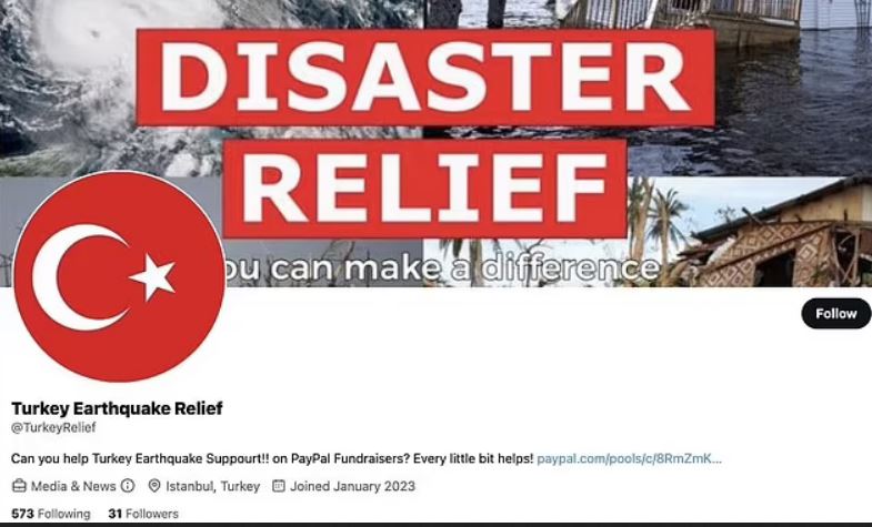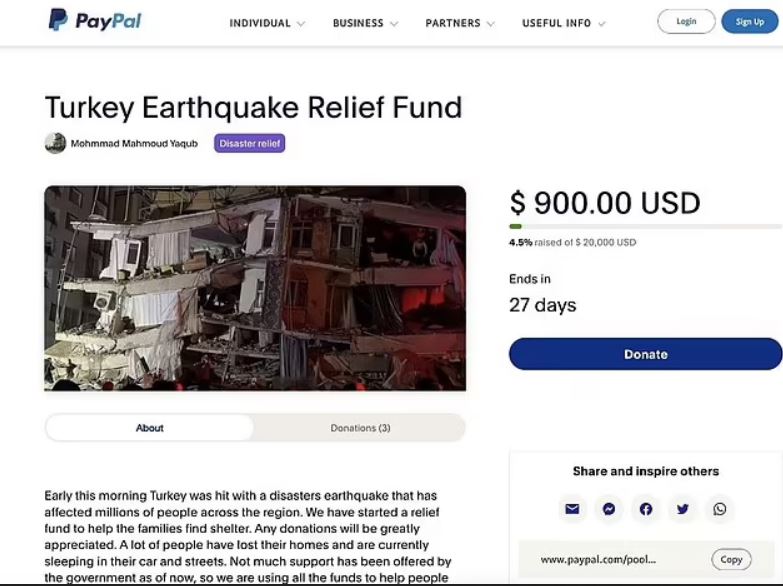 Σύμφωνα με το BBC, ήταν ένας από τους περισσότερους από 100 εράνους που ξεκίνησαν στο PayPal και ζητούσαν δωρεές για τον καταστροφικό σεισμό Τουρκίας-Συρίας. Λέγεται ότι η Bleeping Computer βρήκε σελίδες που κατευθύνουν δωρεές σε προσωπικά πορτοφόλια PayPal. Ο ιστότοπος τεχνολογικών ειδήσεων σημείωσε ότι το PayPal δεν λειτουργεί στην Τουρκία από το 2016, επομένως οι λογαριασμοί Twitter με ονόματα χρήστη που ακούγονται «τουρκικά» και ισχυρίζονται ότι έχουν έδρα στην Τουρκία – ενώ συνδέονται με λογαριασμό PayPal – είναι πιθανότατα αναξιόπιστοι.