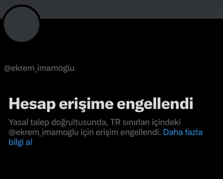 Οι Τούρκοι που προσπαθούν να μπουν στον λογαριασμό λαμβάνουν ένα μήνυμα ότι έπειτα από νομικό αίτημα, η πρόσβαση στον λογαριασμό @ekrem_imamoglu εντός των συνόρων της Τουρκίας έχει αποκλειστεί. Ο λογαριασμός του Ιμάμογλου στο Χ έχει σχεδόν 10 εκατομμύρια ακολούθους.