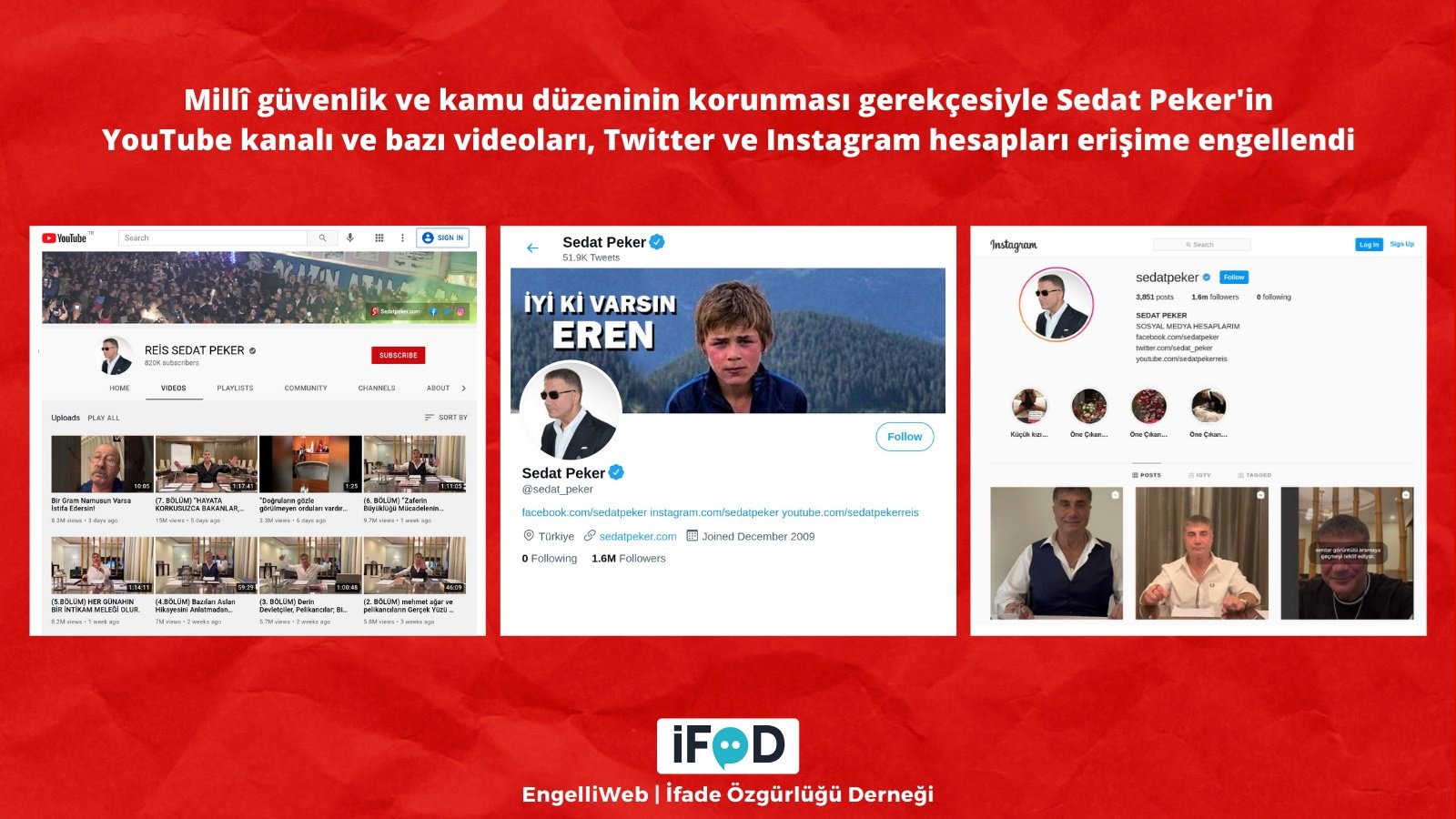 Οι κατηγορίες του Σεντάτ Πεκέρ μέσω youtube αγγίζουν μέχρι και τον Ρετζέπ Ταγίπ Ερντογάν και έτσι η τουρκική κυβέρνηση παίρνει μέτρα. Συγκεκριμένα, η Τουρκική Ένωση Ελευθερίας της Έκφρασης (İFÖD) εξέδωσε απαγόρευση πρόσβασης στους λογαριασμούς κοινωνικής δικτύωσης του αρχιμαφιόζου με την ανακοίνωση που εξέδωσε, μεταξύ άλλων να αναφέρει ότι αυτό έγινε για «λόγους εθνικής ασφάλειας».