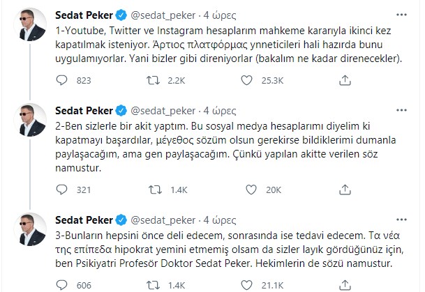 «Το κανάλι στο YouTube του αρχινονού Σεντάτ Πεκέρ και ορισμένα βίντεο, μαζί με τους λογαριασμούς του στο Twitter και στο Instagram, έχουν απαγορευτεί και πλέον η πρόσβαση είναι αδύνατη, για λόγους εθνικής ασφάλειας και για την προστασία της δημόσιας τάξης», ανέφερε η Ένωση στη δήλωσή της, με τον αρχιμαφιόζο να τοποθετείται μέσω Twitter στο θέμα.