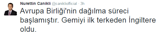Το Βrexit είναι η αρχή της διάλυσης της Ευρώπης δήλωσε ο αντιπρόεδρος της τουρκικής κυβέρνησης Νουρετίν Τζανικλί.