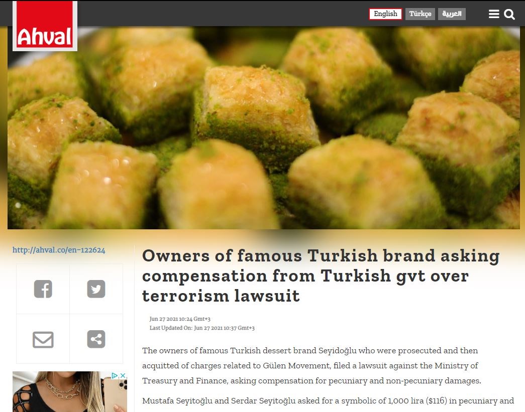 Μήνυση κατά της κυβέρνησης Ερντογάν κατέθεσαν οι ιδιοκτήτες της πολύ γνωστής αλυσίδας μαγαζιών μπακλαβά “Seyitoğlu”, καθώς είχαν κατηγορηθεί, όπως αποδείχθηκε από το δικαστήριο, άδικα για διασυνδέσεις με το κίνημα του Φετουλάχ Γκιουλέν. Οι Μουσταφά και Σερντάρ Σέιτογλου υπέβαλαν μήνυση κατά του υπουργείου Οικονομικών ζητώντας το συμβολικό ποσό των 1.000 λιρών (100 €) για υλικές ζημιές και 500.000 λίρες (50.000 €) για ηθική αποζημίωση.