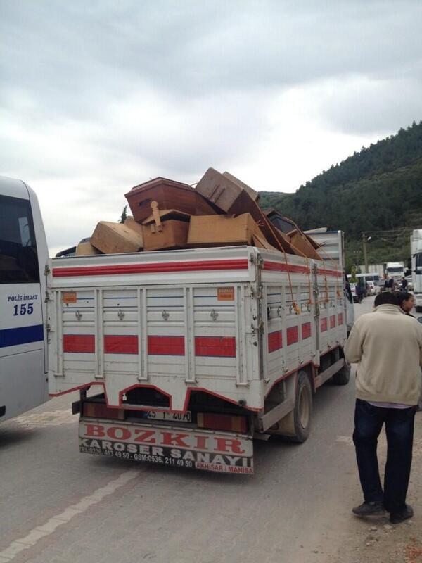 Η φωτογραφία που δημοσίευσε λίγο νωρίτερα το en.enikos.gr απεικονίζει ένα φορτηγό φορτωμένο με φέρετρα που είναι καθ ‘οδόν προς τη Σόμα, την επαρχία Μανίσα της Τουρκίας, όπου περισσότεροι από 200 άνθρωποι έχασαν τη ζωή τους από έκρηξη σε ανθρακωρυχείο.