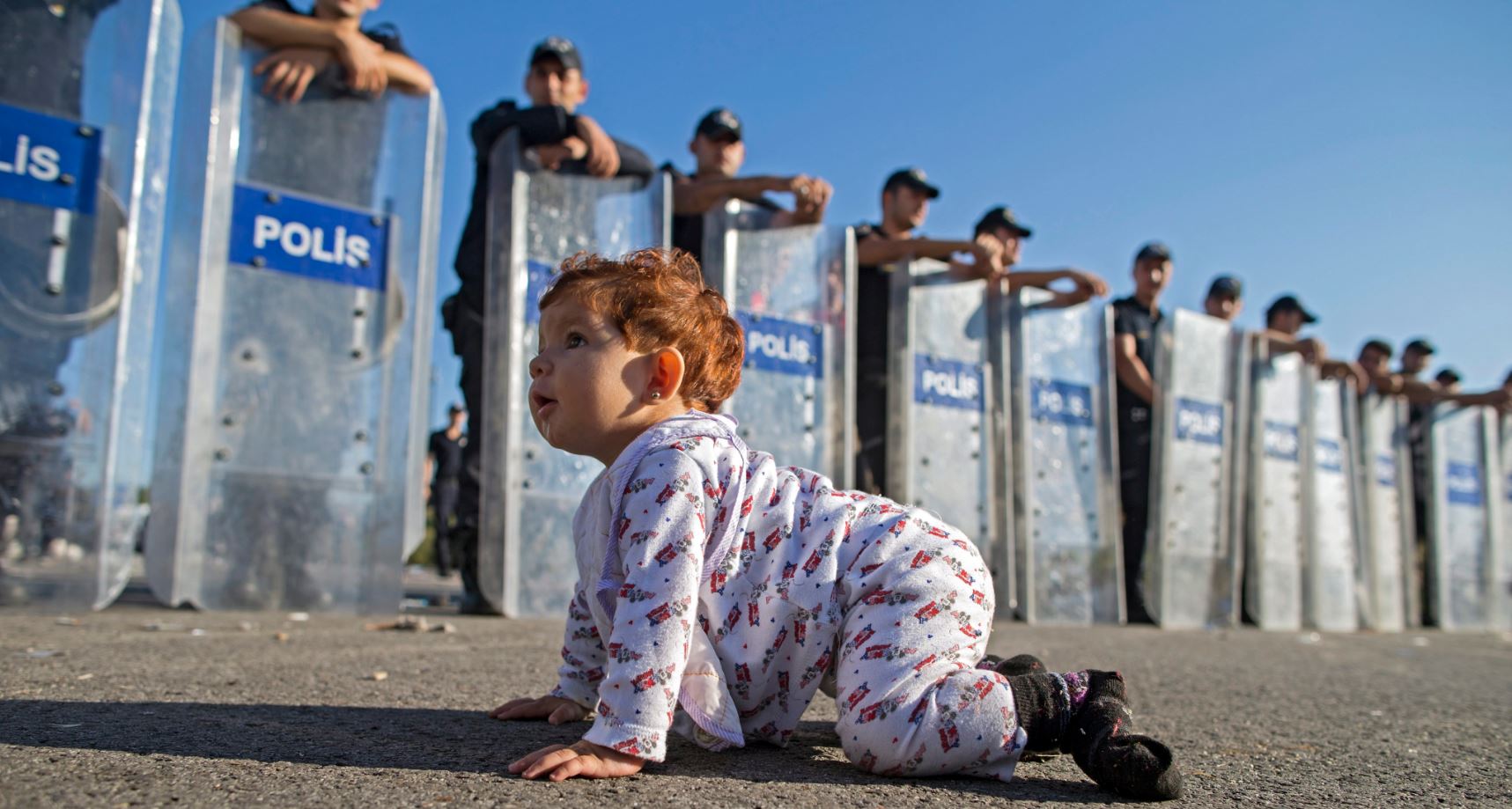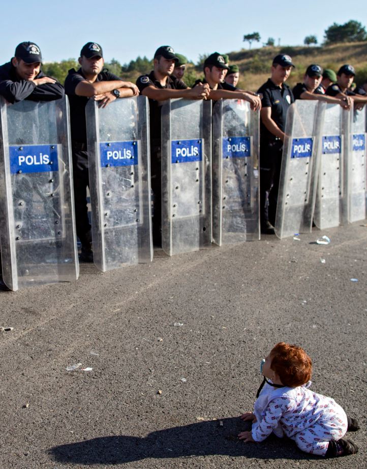 Μία εικόνα που δημιουργεί ανάμεικτα συναισθήματα αποτυπώνει η φωτογραφία στην οποία απεικονίζεται ένα παιδάκι να μπουσουλάει μπροστά από τις αστυνομικές δυνάμεις στα σύνορα της Τουρκίας.