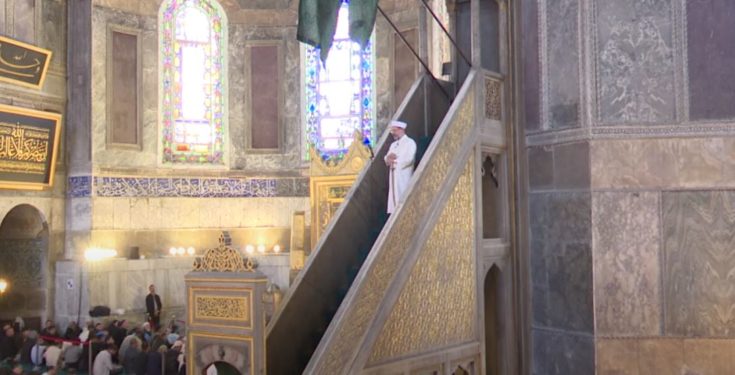 Σε μια προκλητική κίνηση προχώρησε ο διευθυντής Θρησκευτικών Υποθέσεων στην Τουρκία πριν από λίγες ημέρες μέσα στην Αγία Σοφία. Έκανε ομιλία για την κατάσταση στην Μέση Ανατολή και για την Γάζα, ανεβαίνοντας στον άμβωνα και κρατώντας ένα σπαθί.