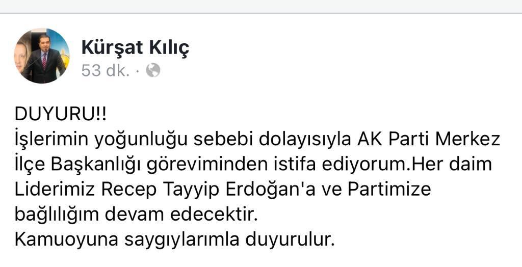Μόλις δημοσιοποιήθηκε το βίντεο το στέλεχος του κόμματος παραιτήθηκε από τη θέση του με ανάρτησή του στο facebook: “Παραιτούμαι από τα καθήκοντά μου ως πρόεδρος της Κεντρικής Περιφέρειας του κόμματος AK λόγω αυξημένου φόρτου εργασίας. Θα παραμείνω πάντα πιστός στον ηγέτη μας, Ρετζέπ Ταγίπ Ερντογάν και στο κόμμα μας”.