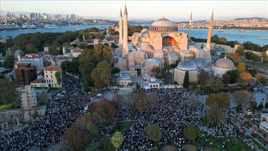 Το Σάββατο χιλιάδες υποστηρικτές των Παλαιστινίων, ανάμεσά τους γιος του προέδρου Ερντογάν κι ένας από τους γαμπρούς του –ο δημοφιλής Σαλτσούκ Μπαϊρακτάρ, συνδιευθύνων σύμβουλος της κατασκευάστριας drones Baykar–, έκαναν πορεία από το μεγάλο παζάρι της Κωνσταντινούπολης ως την Αγιά Σοφιά.