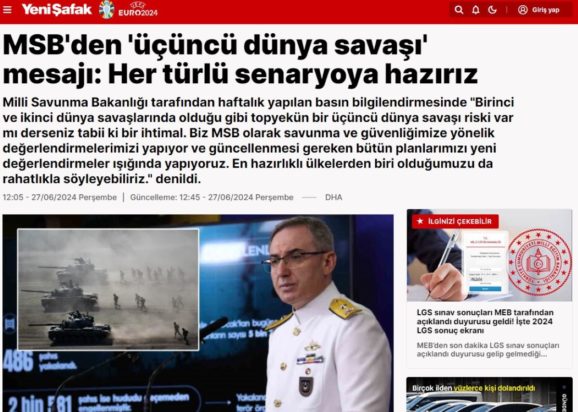 Μάλιστα δημοσίευμα της φιλοκυβερνητικής εφημερίδας Γενί Σαφάκ ανέφερε ότι εφόσον οι προσπάθειες της Τουρκίας να κλείσει τα μέτωπα του πολέμου Ρωσίας-Ουκρανίας και της γενοκτονίας στη Γάζα δεν καρποφόρησαν, η Τουρκία ετοιμάζεται για έναν Παγκόσμιο Πόλεμο.