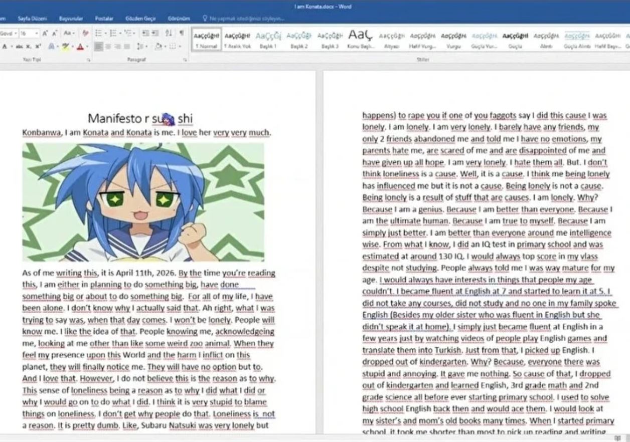 «Καθώς γράφω αυτό, η ημερομηνία είναι 11 Απριλίου 2026. Όταν το διαβάζετε αυτό, είτε θα σχεδιάζω κάτι, είτε θα έχω κάνει κάτι, είτε θα είμαι έτοιμος να κάνω κάτι. Πάντα ήμουν μόνος σε όλη μου τη ζωή. Δεν ξέρω γιατί. Στην πραγματικότητα, είχα τόσα πολλά. Πάντα προσπαθούσα να συνδεθώ με ανθρώπους, αλλά παρέμεινα μόνος. Μου αρέσει όταν οι άνθρωποι με αναγνωρίζουν, με προσέχουν. Θέλω να νιώθουν την ύπαρξή μου σε αυτόν τον κόσμο και το κακό που προκαλώ, ώστε να με προσέξουν επιτέλους. Δεν ξέρω πώς θα συμβεί αυτό, αλλά θα το κάνω. Ωστόσο, η μοναξιά δεν είναι ο λόγος για αυτό που κάνω. Ακόμα κι αν ήθελα, δεν θα μπορούσα να κατηγορήσω τη μοναξιά. Οι άνθρωποι το κάνουν αυτό, αλλά δεν είναι σωστό. Η μοναξιά δεν είναι αιτία…» αναφέρει.
