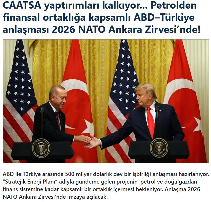Το μέσο ενημέρωσης TR Haber προβάλλει με ιδιαίτερη έμφαση το θέμα, με τίτλο: «Οι κυρώσεις CAATSA αίρονται… Μια συνολική συμφωνία μεταξύ των ΗΠΑ και της Τουρκίας που θα καλύπτει όλα τα θέματα, από το πετρέλαιο έως τις χρηματοοικονομικές συνεργασίες, θα συζητηθεί στη Σύνοδο Κορυφής του ΝΑΤΟ στην Άγκυρα το 2026!».
