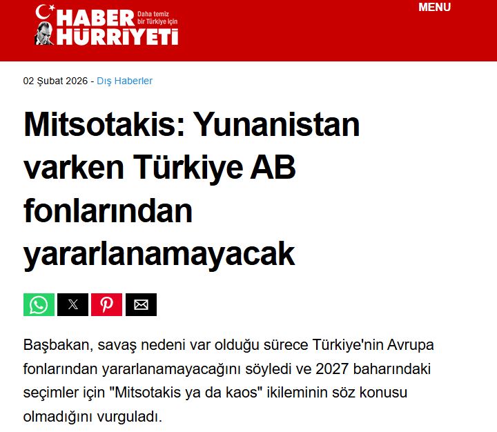 Η Haber Hurriyeti, από την πλευρά της, δίνει έμφαση κυρίως στο θέμα των ευρωπαϊκών κονδυλίων, με τίτλο: «Μητσοτάκης: Όσο υπάρχει η Ελλάδα, η Τουρκία δεν θα μπορεί να επωφεληθεί από τα κονδύλια της ΕΕ».