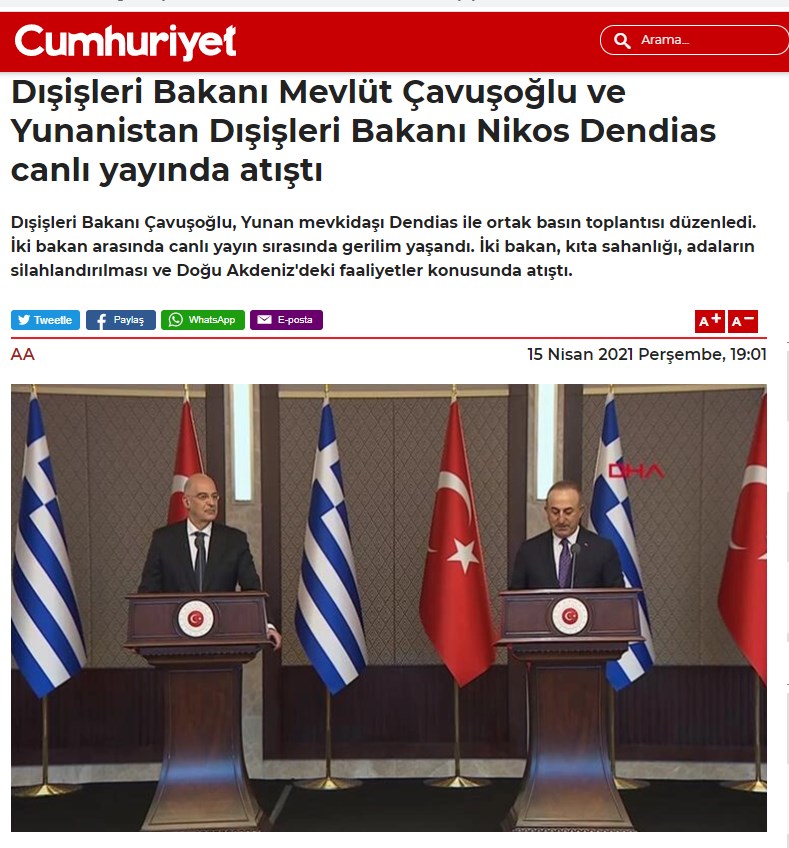 «Ο υπουργός Εξωτερικών Μεβλούτ Τσαβούσογλου και ο Έλληνας υπουργός Εξωτερικών Νίκος Δένδιας τσακώθηκαν live», σημειώνει η Cumhuriyet.