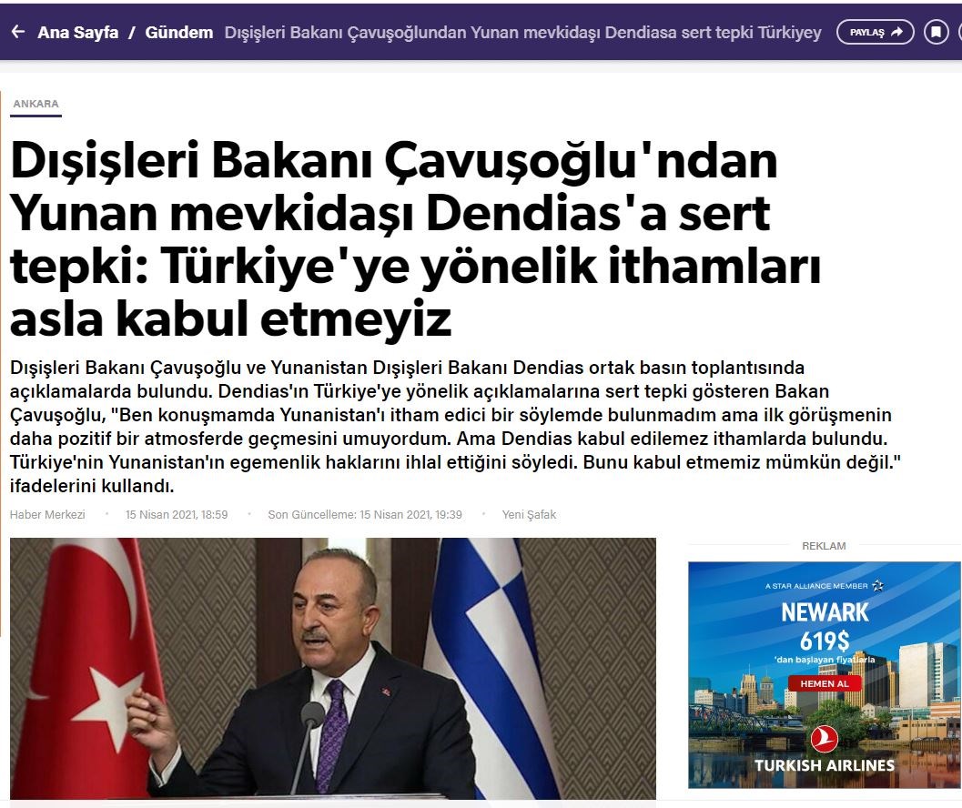 «Οι σκανδαλώδεις κατηγορίες του Έλληνα υπουργού Δένδια, εξόργισαν τον υπουργό Τσαβούσογλου, που απάντησε» αναφέρει το TEZ Haber. «Απάντηση Τσαβούσογλου σε Δένδια : “Δεν μπορούμε ποτέ να δεχτούμε τις κατηγορίες εναντίον της Τουρκίας”», είναι ο τίτλος δημοσιεύματος της φιλοκυβερνητικής εφημερίδας Yeni Safak.