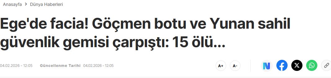 Τέλος, η Haber Global περιέγραψε το περιστατικό ως «Τραγωδία στο Αιγαίο: 15 μετανάστες σκοτώθηκαν σε σύγκρουση με σκάφος του Ελληνικού Λιμενικού», σημειώνοντας ότι οι επιχειρήσεις έρευνας συνεχίζονται στην περιοχή με πλοία και ελικόπτερα του Λιμενικού για τυχόν αγνοούμενους.