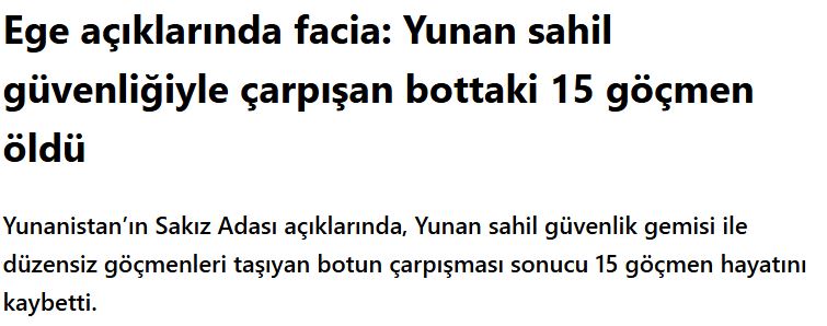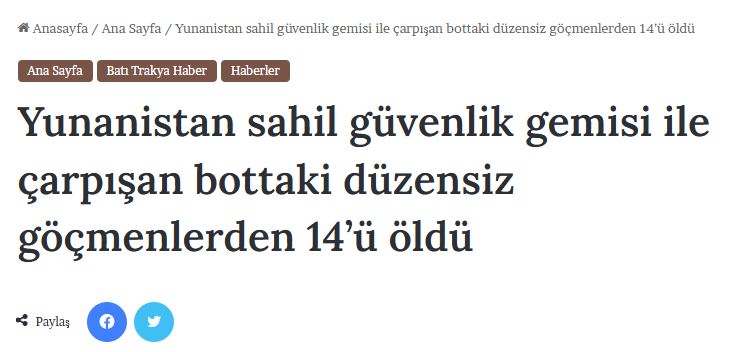 Το TRT Haber ανέφερε ότι «14 μετανάστες πέθαναν αφού το σκάφος τους συγκρούστηκε με σκάφος του Ελληνικού Λιμενικού».