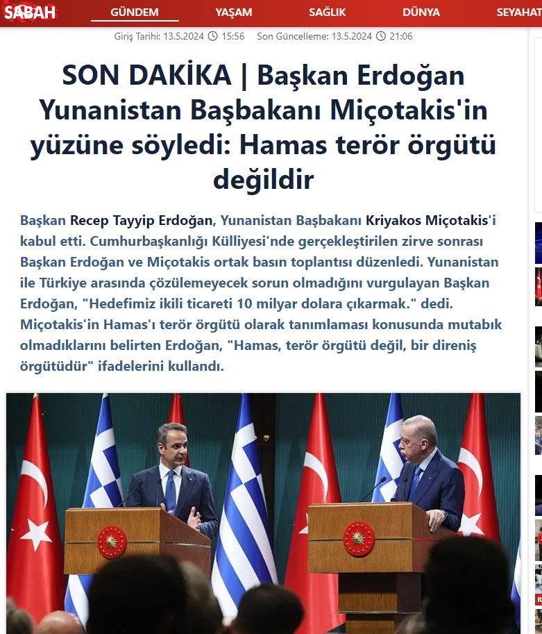 Η τουρκική εφημερίδα Sabah στάθηκε στην διαφωνία που είχαν Μητσοτάκης και Ερντογάν για την Χαμάς και στον τίτλο τονίζει ότι ο Τούρκος πρόεδρος υποστήριξε πώς η Χαμάς δεν είναι τρομοκρατική οργάνωση.