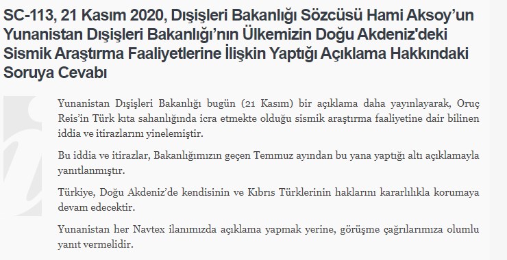 «Το ελληνικό υπουργείο Εξωτερικών εξέδωσε άλλη μία ανακοίνωση σήμερα (21 Νοεμβρίου), επαναλαμβάνοντας τους γνωστούς ισχυρισμούς και τις αντιρρήσεις του σχετικά με την ερευνητική δραστηριότητα για το Oruc Reis που πραγματοποιείται στην τουρκική υφαλοκρηπίδα.