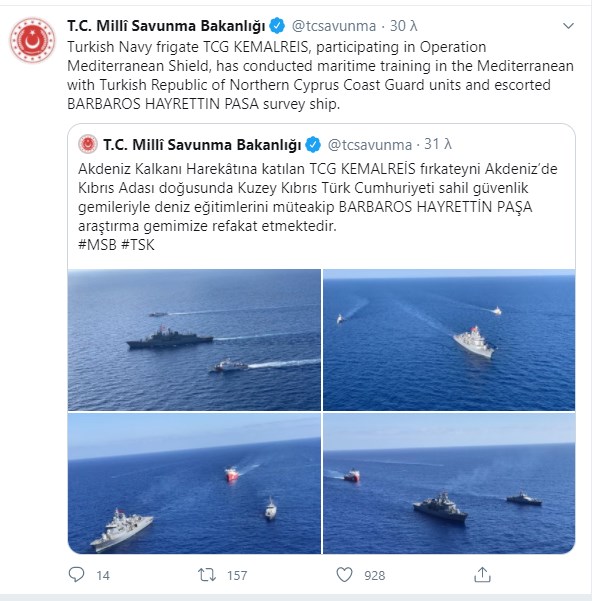 Το τουρκικό υπουργείο Άμυνας, με ανακοίνωσή του στο Twitter αναφέρει ότι η φρεγάτα «Kemal Reis» συμμετείχε στην “επιχείρηση Μεσογειακή Ασπίδα”. Όπως αναφέρει πραγματοποιείται μαζί με το Λιμενικό των Τουρκοκυπρίων και συνόδευσε το Barbaros στην Κύπρο.