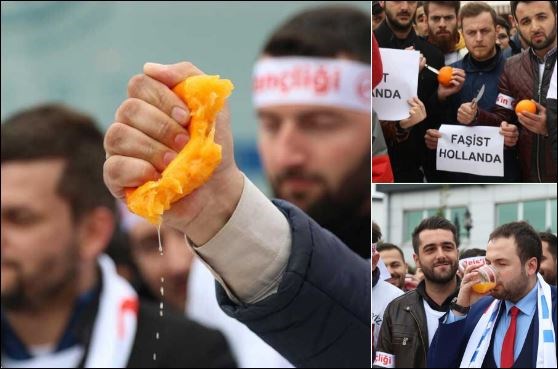Τα μέλη της νεολαίας του Κόμματος Δικαιοσύνης και Ανάπτυξης (AKP) στην Τουρκία, επέλεξαν έναν ιδιαίτερο τρόπο για να “εκδικηθούν” την Ολλανδία.Στη συγκέντρωση του Τούρκου προέδρου Ρετζέπ Ταγίπ Ερντογάν, στην επαρχία Κοτζάελι, οι νεαροί που είχαν συγκεντρωθεί, άρχισαν να μαχαιρώνουν και να στύβουν πορτοκάλια. Μάλιστα, αρκετοί ήταν εκείνοι που έπιναν και τον χυμό. Με τον τρόπο αυτό θέλησαν να στείλουν το δικό τους μήνυμα στην Ολλανδία καθώς το πορτοκαλί είναι το εθνικό χρώμα της χώρας.Πηγή φωτο: twitter
