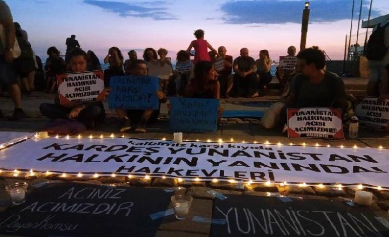 Σε άλλη μία συγκινητική εκδήλωση συμπαράστασης εκατοντάδες Τούρκοι συγκεντρώθηκαν το βράδυ της Πέμπτης έξω από το ιστορικό κτίριο του Γενικού Προξενείου της Ελλάδας στη Σμύρνη, προκειμένου να στείλουν μήνυμα στήριξης στους πληγέντες των φονικών πυρκαγιών στην Αττική.Η Γενική Πρόξενος της Ελλάδας στη Σμύρνη, Αργυρώ Παπούλια, σε ανάρτησή της στο facebook, αναφέρει πως «ήταν για όλους μας μια ιδιαίτερη στιγμή. Μέλη εργατικών συνδικάτων συγκεντρώθηκαν έξω από το κτήριο του Γενικού Προξενείου της Ελλάδας στη Σμύρνη για να τιμήσουν τη μνήμη των αδικοχαμένων θυμάτων των πυρκαγιών στην Ελλάδα και να εκφράσουν την αλληλεγγύη τους στον ελληνικό λαό. Κρατούσαν πανό με τίτλο «Κρατάτε γείτονες» αντιγράφοντας το γνωστό τίτλο της ιστορικής εφημερίδας Ελευθεροτυπίας στις 17.8.1999 όταν ο τουρκικός λαός δοκιμαζόταν από το σεισμό. Τους ευχαριστήσαμε και επισημάναμε την ιδιαίτερη αξία της αλληλεγγύης και της ειρηνικής συνεργασίας των γειτονικών λαών».Σύμφωνα με ρεπορτάζ του ΑΝΤ1, περίπου 180-200 Τούρκοι πολίτες, ανάμεσά του και μέλη εργατικών συνδικάτων, συγκεντρώθηκαν έξω από το κτήριο χθες στις 20.30 το βράδυ με πανό, γαρύφαλλα και αναμμένα κεριά, για να τιμήσουν τη μνήμη των νεκρών στην Ελλάδα και κρατώντας ενός λεπτού σιγή θέλησαν να εκφράσουν την συμπόνοια τους αλλά και τη αλληλεγγύη τους στον ελληνικό λαό.Μπροστά στο ξαφνικό και αυθόρμητο αυτό κύμα συμπαράστασης των Τούρκων πολιτών, το ελληνικό προξενείο στη Σμύρνη άνοιξε αμέσως τα παράθυρά του και η Γενική Πρόξενος, μαζί με τους υπαλλήλους που βρίσκονταν εκείνη τη στιγμή μέσα χειροκροτούσαν το συγκεντρωμένο πλήθος για την ευαισθησία τους.Οι συγκεντρωθέντες άφησαν μάλιστα στην πόρτα του ιστορικού κτηρίου του προξενείου της Ελλάδας στην Σμύρνη λουλούδια, ενώ συγκινημένη η Αργυρώ Παπούλια σε μία μικρή δήλωση που έκανε προς τους συγκεντρωμένους είπε: «Σε μία κοινωνία γίνονται πάντα και άσχημα πράγματα. Αλλά εμείς πιστεύουμε στη φιλία του λαού της Τουρκίας. Θα μεταφέρουμε το μήνυμά σας στο λαό της Ελλάδας».Λίγο αργότερα τουρκικό συγκρότημα παρέθεσε συναυλία στην παραλία της Σμύρνης ερμηνεύοντας ελληνικά τραγούδια.Το ελληνικό προξενείο στη Σμύρνη λαμβάνει καθημερινά αμέτρητα μηνύματα συμπαράστασης από τους Τούρκους πολίτες, ενώ πολλές εταιρείες και επιχειρήσεις έχουν μάλιστα προσφερθεί να συνδράμουν και εμπράκτως στις όποιες ανάγκες των πυρόπληκτων.Δείτε τις φωτογραφίες: