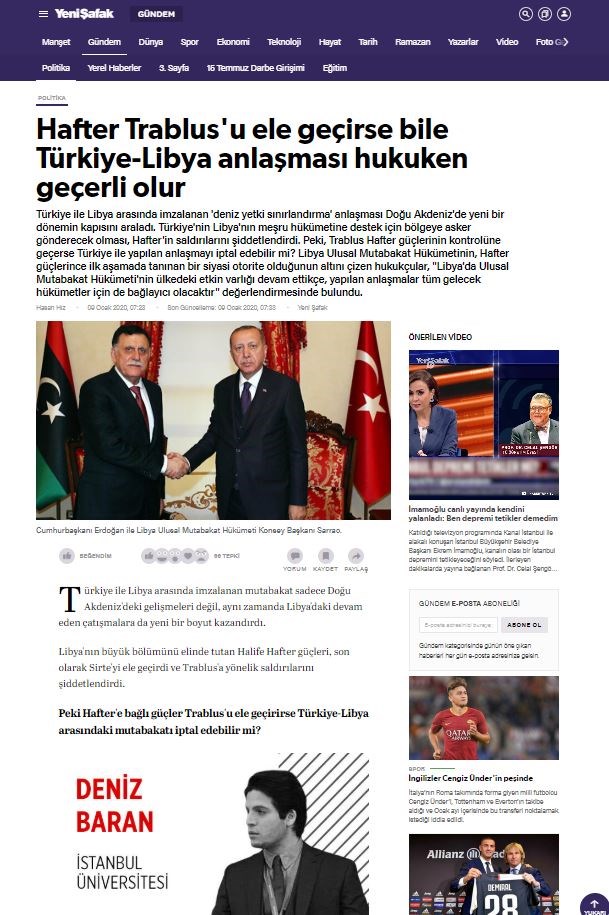 Ακόμη και αν ο στρατάρχης Χαφτάρ καταλάβει την Τρίπολη, η συμφωνία Τουρκίας – Λιβύης θα εξακολουθήσει να ισχύει, γράφει η τουρκική εφημερίδα “Yeni Safak”, η οποία επικαλείται Τούρκο καθηγητή νομικού δικαίου.