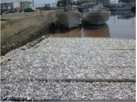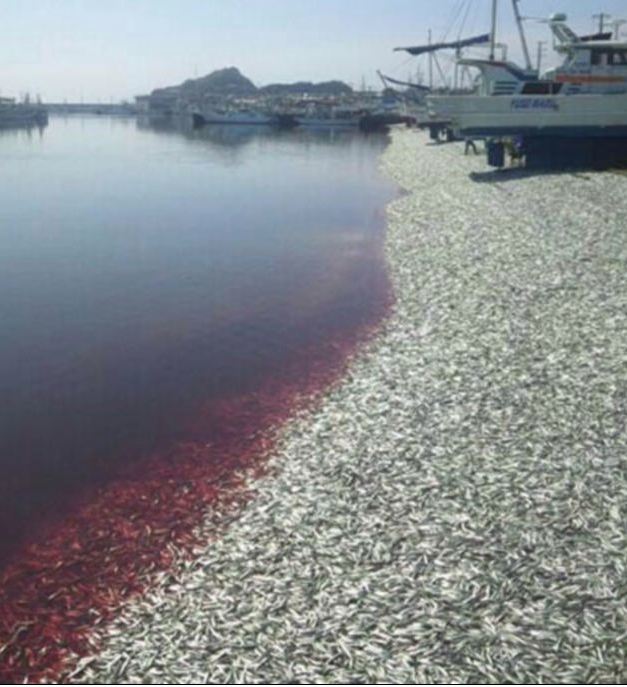 Έκπληκτοι οι κάτοικοι της ιαπωνικής πόλης, Οχάρα, στην περιφέρεια της Σίμπα, αντίκρισαν, το πρωί της περασμένης Κυριακής, χιλιάδες νεκρές σαρδέλες στη στεριά ενώ τα νερά της παράκτιας ζώνης είχαν αποκτήσει ένα τρομακτικό κόκκινο χρώμα. Για να γλιτώσουν από τυχόν ασθένειες οι κάτoικοι του χωριού μάζεψαν τα νεκρά ψάρια και τα έριξαν σε ειδικούς χώρους υγειονομικής ταφής. Μόλις μάζεψαν με τα φορτηγά τα νεκρά ψάρια από τις ακτές, η θάλασσα άρχισε να ξεβράζει κι άλλες νεκρές σαρδέλες. Επειδή, τα ψάρια που είχε ξεβράσει η θάλασσα ήταν μόνο σαρδέλες και δεν υπήρχε κάποιο άλλο είδος, οι επιστήμονες παραξενεύτηκαν και προβληματίστηκαν από το γεγονός, καθώς δεν μπορούσαν να αποδώσουν το γεγονός σε μόλυνση του ωκεανού. Οι ειδικοί ανησυχούν γιατί το φαινόμενο δεν μοιάζει με την περσινή κατάσταση που αντιμετώπισε η Καλιφόρνια όταν τόνοι διάφορων ψαριών ξεβράστηκαν στις ακτές επειδή μάλλον είχαν παγιδευτεί σε μέρος χωρίς οξυγόνο.