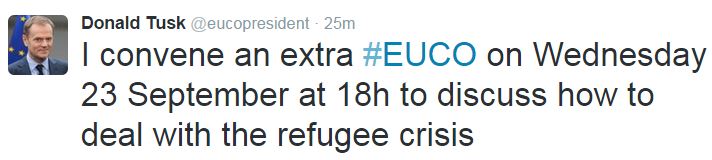 Η έκτακτη Σύνοδος Κορυφής των Ευρωπαίων ηγετών για το προσφυγικό θα διεξαχθεί στις 23 Σεπτεμβρίου, όπως ανακοίνωσε ο πρόεδρος του Ευρωπαϊκού Συμβουλίου, Ντόναλντ Τουσκ.