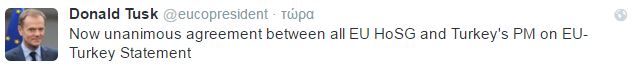«Ομόφωνη συμφωνία της ΕΕ με τον Πρωθυπουργό της Τουρκίας» έγραψε ο πρόεδρος του Ευρωπαϊκού Συμβουλίου, Ντόναλντ Τουσκ στο twitter.