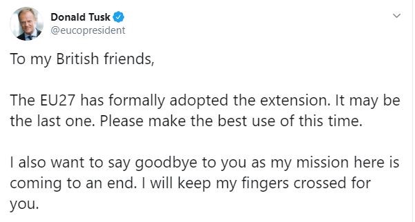 Ο πρόεδρος του Ευρωπαϊκού Συμβουλίου Ντόναλντ Τουσκ ανακοίνωσε ότι η Ευρωπαϊκή Ένωση ενέκρινε και επίσημα την αναβολή του Brexit έως το τέλος του Ιανουαρίου 2020.