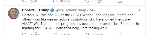 Ο Ντόναλντ Τραμπ έγραψε στο Twitter ότι αισθάνεται καλά με την βοήθεια των γιατρών και των νοσηλευτών του στρατιωτικού νοσοκομείου Walter Reed.
