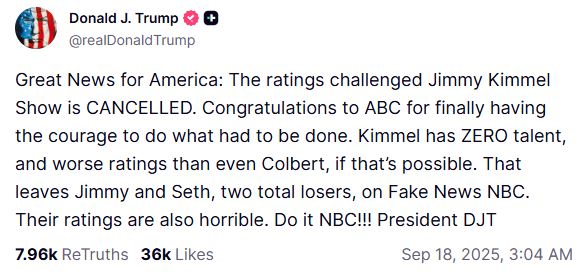 Μία ημέρα νωρίτερα, ο Τραμπ είχε συγχαρεί το ABC για την απόφασή της να αποσύρει επ’ αόριστον την εκπομπή του Τζίμι Κίμελ, μετά τα σχόλια που έκανε στον αέρα για τη δολοφονία του συντηρητικού ακτιβιστή Τσάρλι Κερκ.