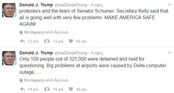 «Μόνο 109 άνθρωποι από τους 325.000 προσήχθησαν για ανάκριση. Τα μεγάλα προβλήματα στα αεροδρόμια προκλήθηκαν από βλάβη στους ηλεκτρονικούς υπολογιστές της Delta, τους διαδηλωτές και τα δάκρυα του γερουσιαστή (Τσακ) Σούμερ. Ο υπουργός Κέλι δήλωσε ότι όλα πηγαίνουν καλά με πολύ λίγα προβλήματα. ΚΑΝΤΕ ΚΑΙ ΠΑΛΙ ΤΗΝ ΑΜΕΡΙΚΗ ΑΣΦΑΛΗ!» έγραψε ο Τραμπ στο Twitter. Το βράδυ της Κυριακής το σύστημα της Delta υπέστη βλάβη.