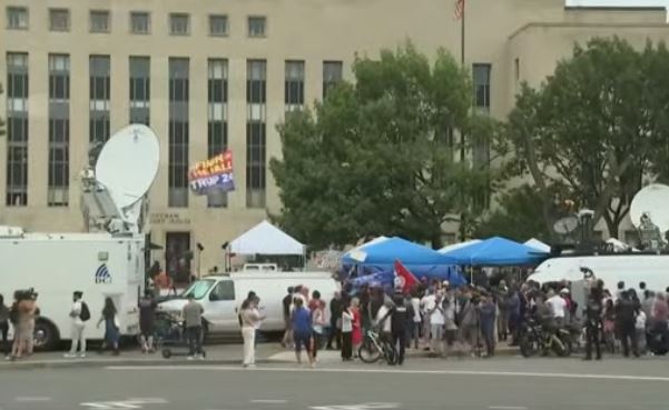 Οπαδοί του Τραμπ έχουν σπεύσει με πλακάτ έξω από το δικαστήριο για να διαμαρτυρηθούν για τις κατηγορίες σε βάρος του.
