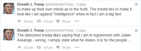 “Τα μέσα ενημέρωσης ψεύδονται για να πείσουν ότι είμαι κατά των (υπηρεσιών) πληροφοριών, ενώ στην πραγματικότητα είμαι μεγάλος οπαδός τους”, έγραψε ο Τραμπ στη σελίδα του.