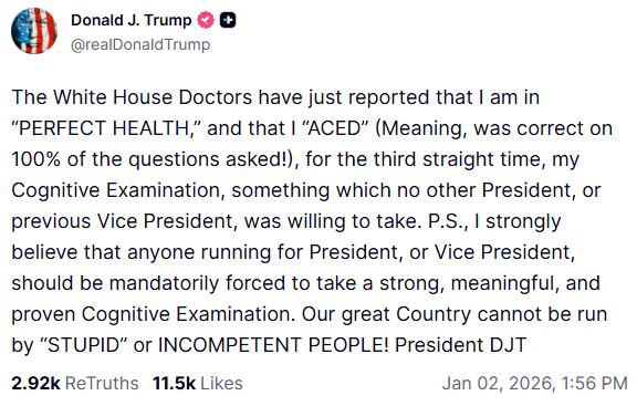 «Οι γιατροί του Λευκού Οίκου μόλις ανακοίνωσαν ότι είμαι σε “τέλεια υγεία” και ότι “έσκισα” (δηλαδή, απάντησα σωστά στο 100% των ερωτήσεων) για τρίτη φορά στη σειρά στην Γνωστική μου Εξέταση», έγραψε ο 79χρονος Ρεπουμπλικανός πρόεδρος στο μέσο κοινωνικής δικτύωσης Truth Social.