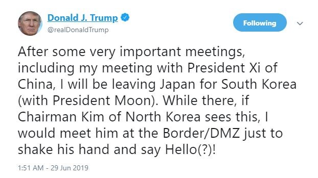 Προτού φτάσει χθες, Σάββατο, στη Νότια Κορέα, ο Τραμπ προσκάλεσε μέσω ανάρτησης του στο Twitter τον Κιμ Γιονγ Ουν να έρθει στην Αποστρατιωτικοποιημένη Ζώνη ανάμεσα στη Νότια και τη Βόρεια Κορέα για να του πει “καλημέρα”.