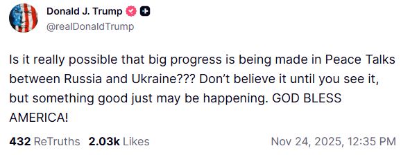 Ο Τραμπ, σε ανάρτησή του στο Truth Social, δήλωσε: «Είναι πραγματικά δυνατό να σημειώνεται μεγάλη πρόοδος στις ειρηνευτικές συνομιλίες μεταξύ Ρωσίας και Ουκρανίας; Μην το πιστέψετε μέχρι να το δείτε, αλλά ίσως συμβαίνει κάτι καλό».